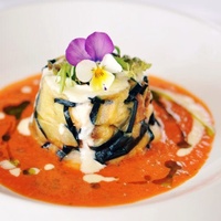 意式乳酪烤茄子饼配奶油番茄汁和罗勒酱