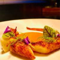低温鸭胸/糖渍橙皮/鸭肉吐司挞/香橙奶油汁/ 香草油/黑醋鱼子