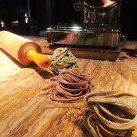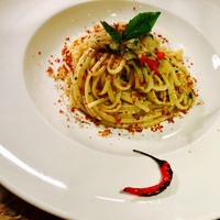 蒜香辣味橄榄油意面,配风干圣丹尼火腿碎。
