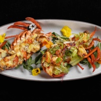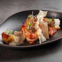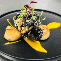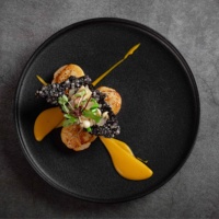 嫩煎澳带佐橙味南瓜,墨鱼汁西米脆片