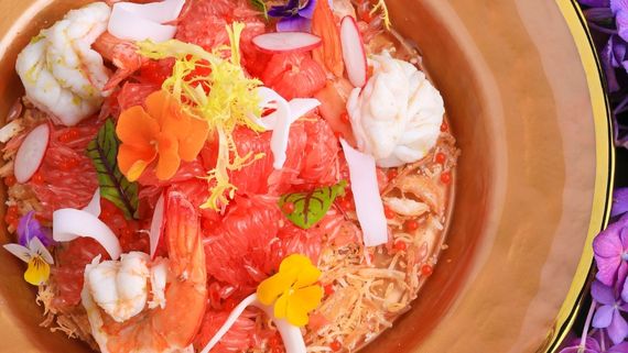 摩登泰用一道大虾沙拉,诠释出传统泰式料理的“酸辣”之道。鲜而不冲的辣沙拉汁由小米辣、青柠汁与鱼露和椰糖打造而成,再搭配柚子肉自然柔和的果酸和芒果软糯的甜美,平衡适中,不争不抢地将虾肉的清甜鲜美烘托出来。