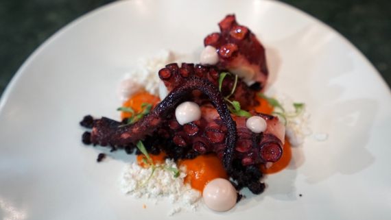 来自意大利海滨城市那不勒斯的 FRESCO 翡酷牛排餐厅主厨 Fabio,打破了常见的章鱼、彩椒、橄榄的沙拉定式,带来了这道阿马尔菲风味章鱼。将烤好的红彩椒酱打成泥,加入苹果醋、欧芹、橄榄油制酱,搭配用蒸章鱼留下的汤汁制成的章鱼蛋黄酱,以及自制风干橄榄粉,浓郁的南美风味即现。