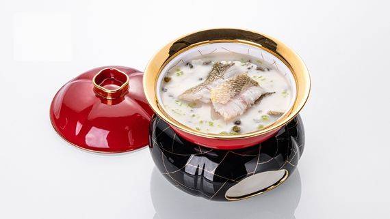莼菜被比作水中燕窝,口感滑嫩、滋味清淡隽永,其润滑的胶质使汤能自带勾薄芡的效果。葛仙米是一种可食用蓝藻,味清甘鲜,是菜中珍品,且富含高蛋白。在制作时,师傅把黄鱼骨蒸后再炖,与莼菜和葛仙米组合成一道鲜醇无比的黄鱼浓羹。