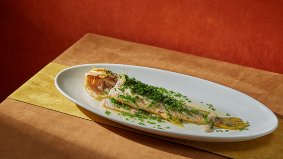 本帮菜中,除了浓油赤酱,也有突出本鲜的清蒸做法。这道清蒸葱油大黄鱼选用台州中鹿岛的大黄鱼入馔,看似简单的清蒸,对温度和时长的把控却很有讲究。蒸制完成后,淋上堪称点睛之笔的自制热葱油,以滋滋声响注入扑鼻葱香。